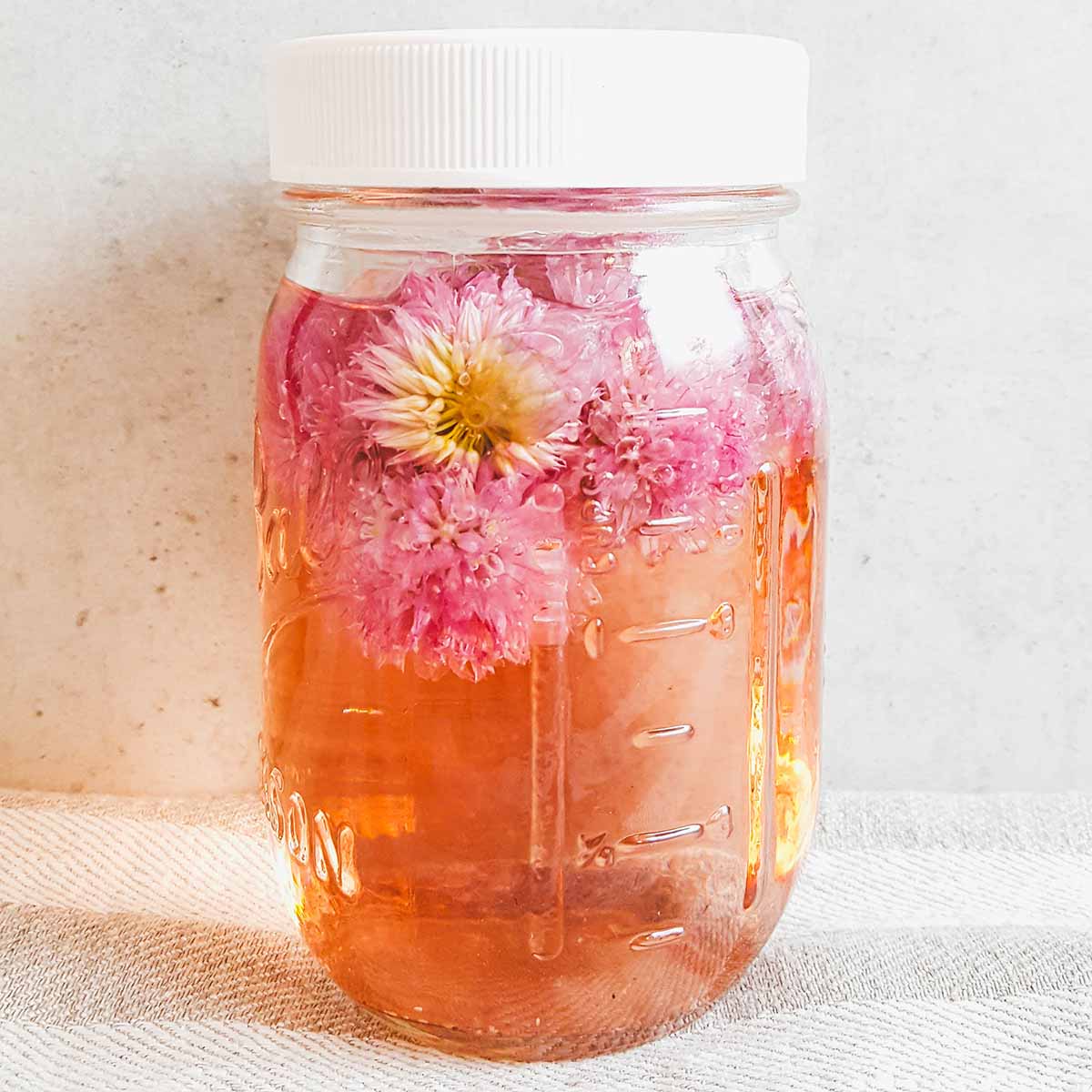 - Put the chive blossoms in a glass jar and pour the vinegar over the top.