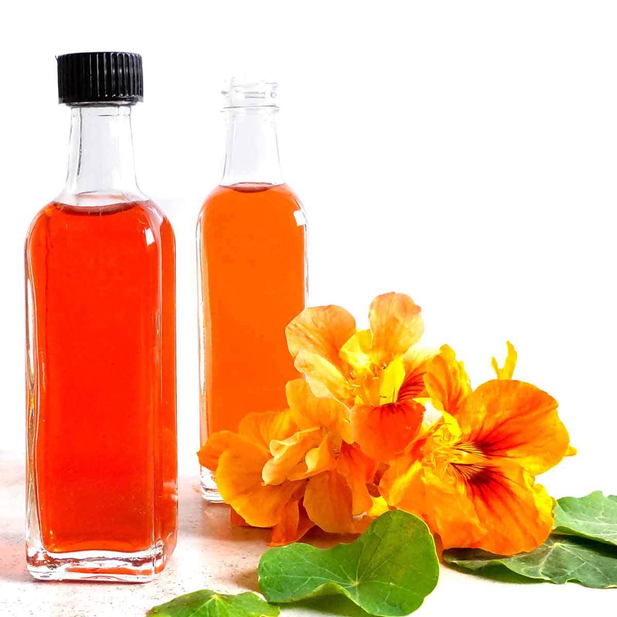 A nasturtium-infused vinegar is peppery and works great in salad dressings or anything that benefits from a splash of vinegar. It's also a bright red-orange color that looks cute for gifts.